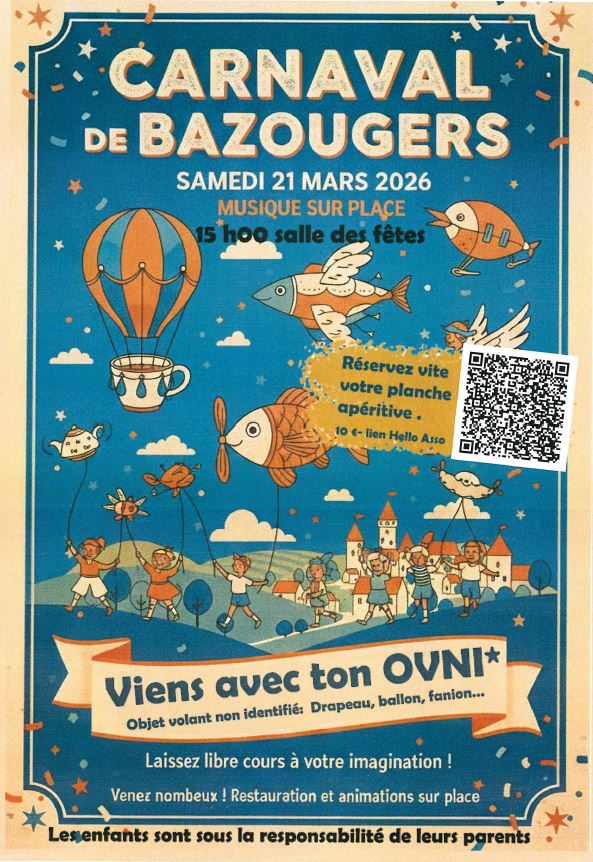 Les associations de parents d'élèves, APE école Simone Veil et APEL école Saint Paul-Sacré Coeur Bazougers-La Bazouge organisent un carnaval le samedi 21 mars 2026, à 15 heures, à la Salle des fêtes de Bazougers.
